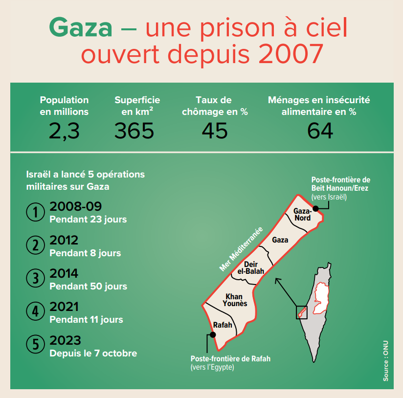 Comme l'a déclaré le secrétaire général des Nations unies, Antonio Guterres, l'attaque du Hamas du 7 octobre n’est pas partie de rien. Elle a été précédée d'une longue histoire de colonisation et d'oppression du peuple palestinien. Le projet sioniste, dont l'objectif était d'établir un État juif en Palestine, n'a à aucun moment pris en compte les Palestiniens et procède à une épuration ethnique du territoire originel de la Palestine depuis la Nakba, en 1948. Ce processus est toujours en cours. Les Palestiniens qui n'ont pas (encore) fui sont confrontés à la violence quotidienne des colons israéliens, aux offensives répétées d’Israël, ou se retrouvent enfermés dans la « prison à ciel ouvert » qu’est Gaza.