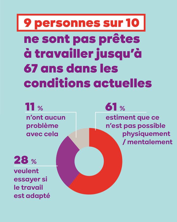 9 personnes sur 10 ne se voient pas travailler jusqu’à 67 ans dans les conditions actuelles. Et 7 personnes sur 10 la trouvent injuste pour les femmes. Parce que pour énormément de personnes, travailler plus longtemps est tout simplement infaisable.