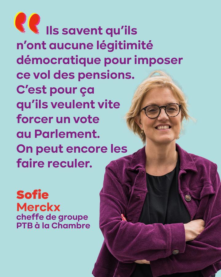 « Ils savent qu’ils n'ont aucune légitimité démocratique pour imposer ce vol des pensions, déclare Sofie Merckx, cheffe de groupe PTB à la Chambre. C’est pour ça qu'ils veulent vite forcer un vote au Parlement. On peut encore les faire reculer. »