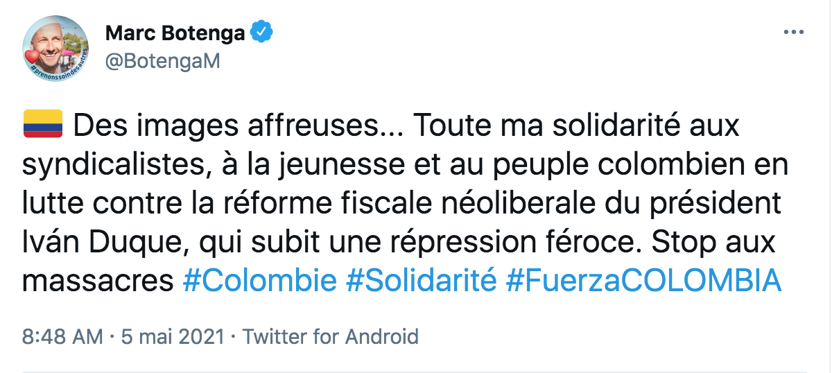 Le gouvernement est responsable de ces violations des droits humains, celui-ci ayant envoyé la police, l’ESMAD et l’armée faire face aux manifestants. Il massacre ses propres habitants. C’est à la suite de l’intervention de l’ancien président Uribe que le gouvernement a envoyé l’armée dans les rues.