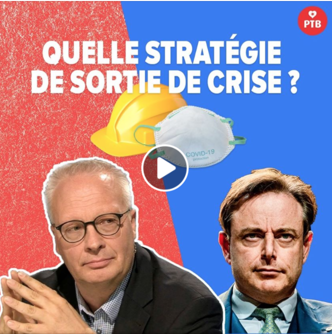 PTB contre N-VA : santé, économie et stratégie de sortie de crise Pour sortir du confinement, il faut que le virus soit confiné. Ce n’est possible qu’avec une stratégie de sortie de crise sûre. Or, la FEB (la Fédération des grandes Entreprises de Belgique), la N-VA et les partis de droite veulent coûte que coûte nous faire retravailler rapidement. « La santé et la sécurité des travailleurs doivent être garantis », répond le président du PTB, Peter Mertens. Et pour cela, nous avons besoin d’un approche qui puisse contenir le virus, une approche permettant de « tester, tracer et isoler ». Un débat entre deux visions de sortie de crise. PTB