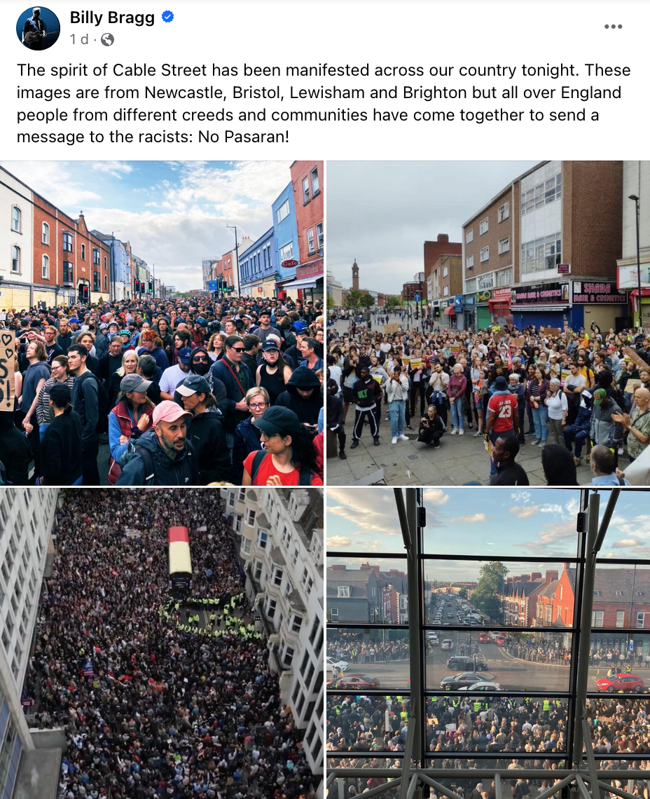 « The spirit of Cable Street has been manifested across our country tonight », a dit Billy Bragg, chanteur et activiste.