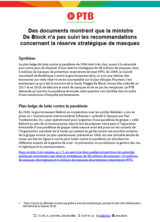Le PTB a pu mettre la main sur des documents qui montrent que la ministre de la Santé, Maggie De Block, était bien consciente de l'importance d'une réserve stratégique de masques de protection. Les experts ont déjà averti le gouvernement en 2009 que l'offre de masques dans notre pays était « insuffisante » et que « d’un point de vue éthique, il semble en effet inacceptable d’économiser ces dépenses ». Pendant dix ans, les différents gouvernements n'ont rien fait. Pire encore : en 2018, le ministre De Block a décidé de détruire 6 millions de masques de haute qualité (FFP2) et de ne pas les remplacer.