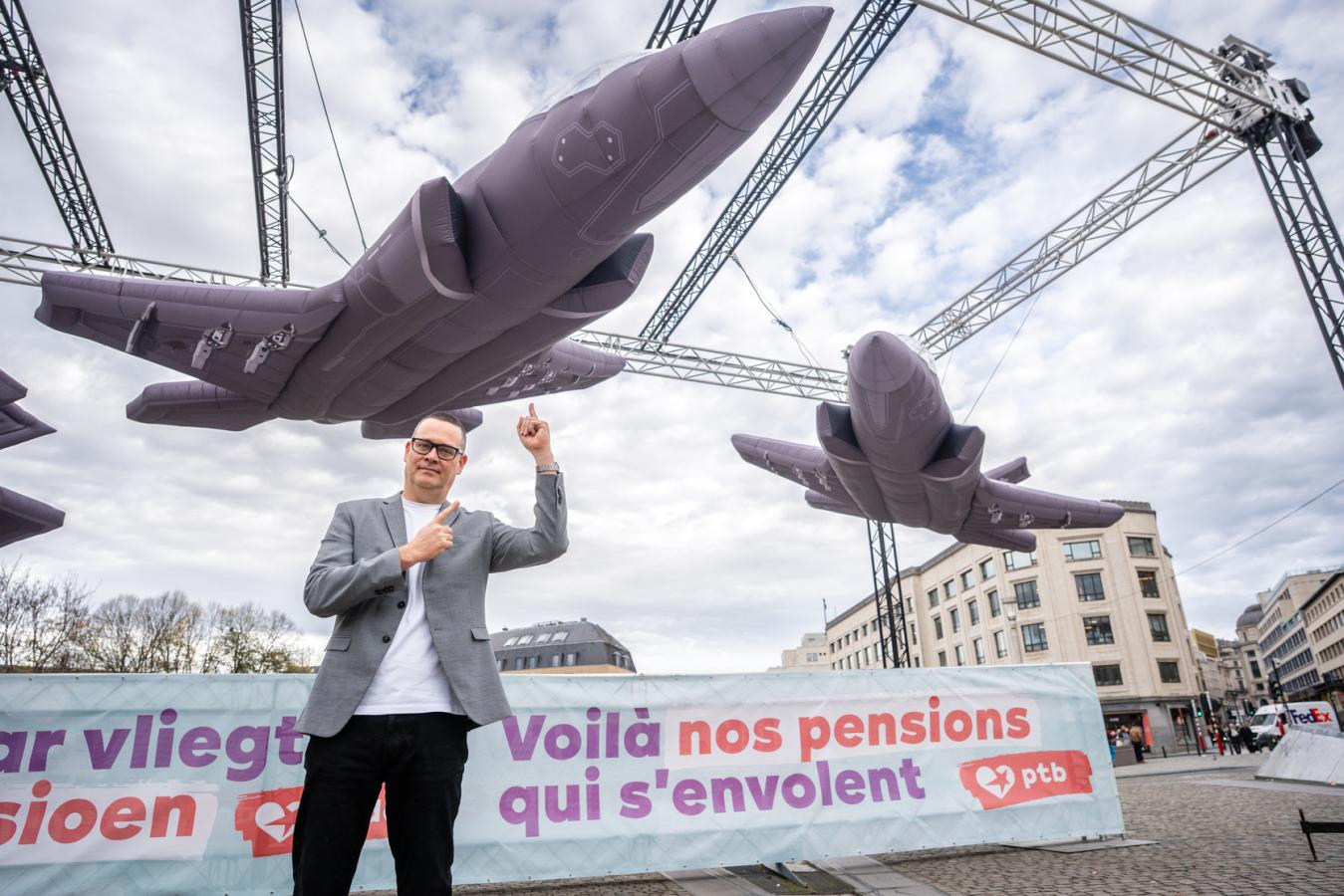 Trois F-35 gonflables survolent les passants devant la gare Centrale, en plein centre de Bruxelles. Un banderole proclame en gros caractères : « Voilà nos pensions qui s’envolent ».