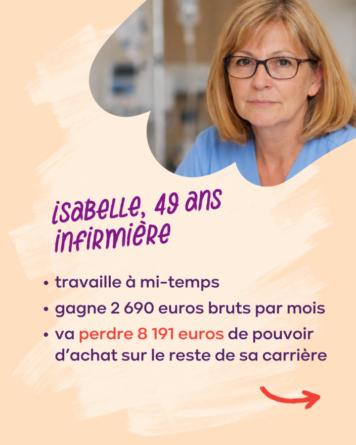 Prenons l’exemple d’Ingrid : elle a 49 ans, travaille à mi-temps comme infirmière et gagne 2 690 euros bruts par mois. Avec ce plafonnement de l’index, elle perdrait, d’après les estimations, 8 191 euros de pouvoir d’achat sur le reste de sa carrière.