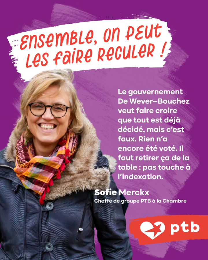 Le vol de l’index peut encore être arrêté. Sofie Merckx : « Le gouvernement De Wever–Bouchez veut faire croire que tout est déjà décidé, mais c’est faux. Rien n’a encore été voté et, surtout, leur plan est plein de failles. On voit apparaître sans cesse de nouvelles formes de discrimination. Cette mesure risque de ne pas tenir juridiquement et doit être retirée. Le gouvernement ferait mieux de ne pas toucher à l’indexation automatique des salaires et des allocations sociales. »