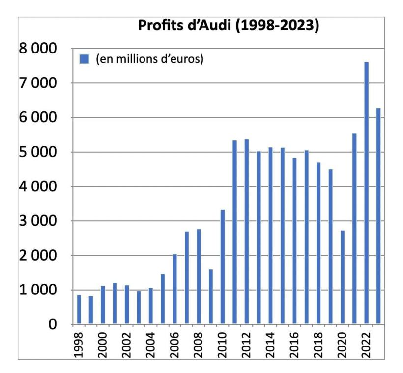 Ces deux dernières années, le groupe Audi a réalisé les deux plus gros bénéfices de son histoire en 2022 et 2023, grâce au travail acharné de ses travailleurs. En 1998, son bénéfice opérationnel restait sous la barre du milliard d’euros alors qu’il atteignait 6,3 milliards d’euros en 2023 et 7,6 milliards en 2022. C’est ce qui faisait dire au journal L’Écho qu’Audi « est une vache à lait du groupe Volkswagen ».