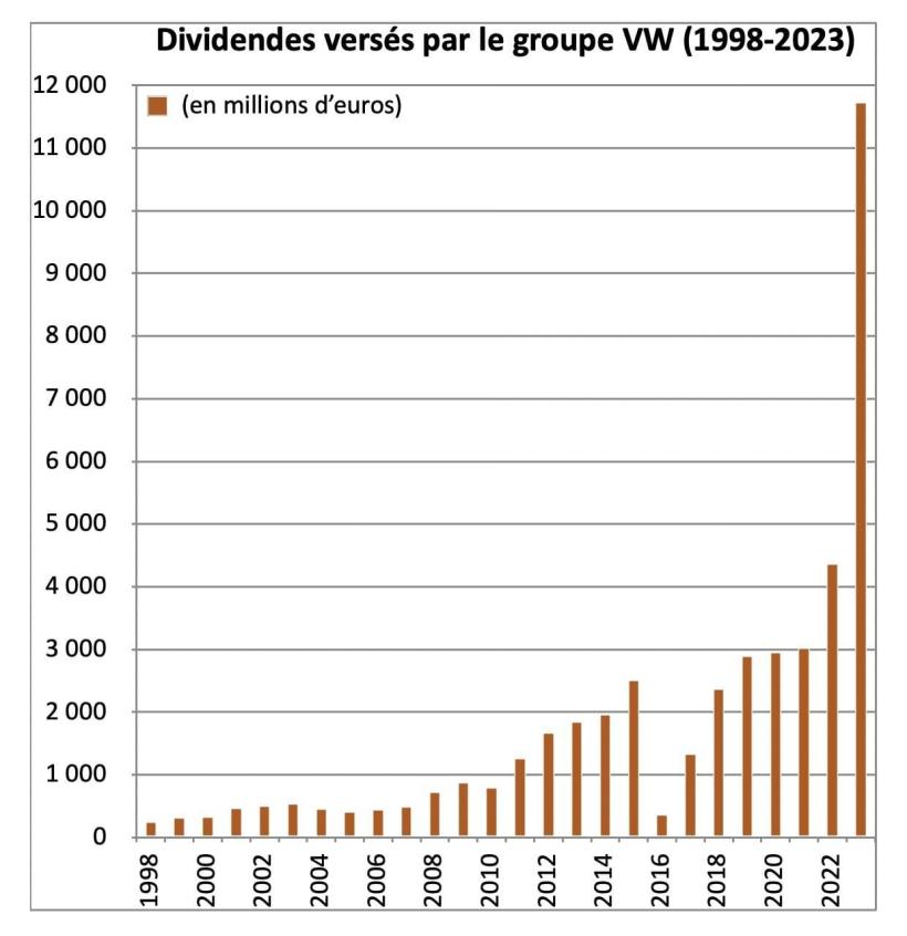 Le groupe Volkswagen, le plus gros constructeur automobile européen auquel appartient la marque Audi, a lui distribué près de 12 milliards en dividendes à ses actionnaires en 2023. Une année historique pour les actionnaires du groupe qui se sont enrichis de manière exponentielle ces 25 dernières années.