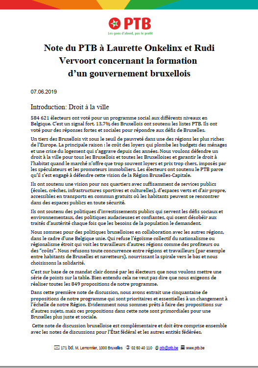 Le PTB avait rencontré Laurette Onkelinx et Rudi Vervoort le mardi 4 juin pour présenter ses points forts, que les électeurs ont soutenu par un vote fort : la mobilité, le logement, l'emploi, le climat, l'éthique politique ou encore la lutte contre les discriminations.