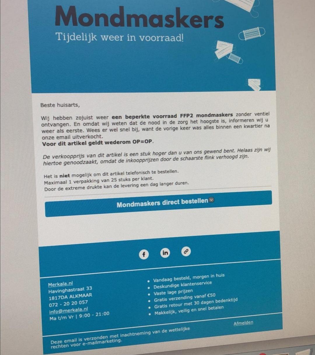 Sur Internet aussi, le commerce fait rage. Sofie Merckx : « nous avons aussi reçu un mail d'un grossiste d'articles médicaux en ligne nous proposant une gamme de masques FFP2 plus sophistiqués, rédigé en ces termes : “au vu des besoins dans le secteur des soins de santé, nous vous informons en priorité de cette offre. La dernière fois que nous avons proposé ce produit, tout notre stock était vendu un quart d'heure après l'envoi du mail. Passez donc rapidement votre commande” ».