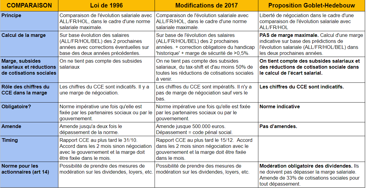 La loi de 96 et les amendements de 2017 à celle-ci partent d'une comparaison salariale avec les pays limitrophes, utilisée pour imposer une norme salariale maximale. La proposition de loi Goblet-Hedebouw part du principe de la liberté de négocier les salaires. Ici, la comparaison avec les pays limitrophes revêt une valeur purement indicative.