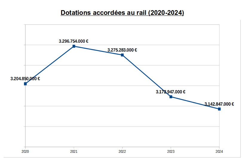 - En examinant l’évolution sur l’ensemble de la législature, on constate qu’après une augmentation des moyens accordés au chemin de fer entre 2020 et 2021, ceux-ci suivent une pente descendante les trois années suivantes, de 2022 à 2024. Avec, sur l’ensemble de la législature, une baisse de 62 millions d’euros (voir graphique).