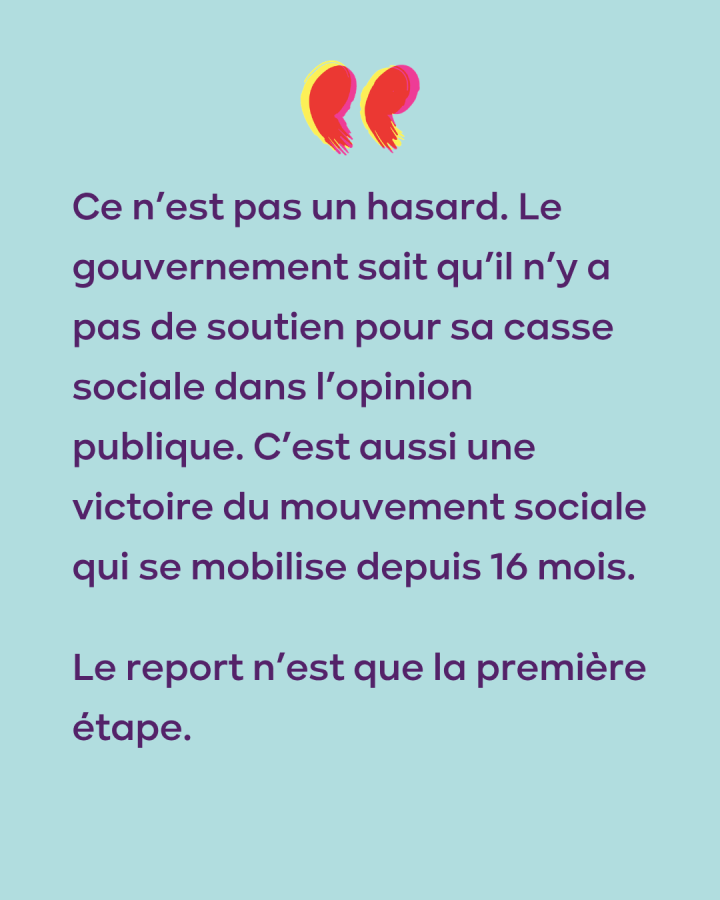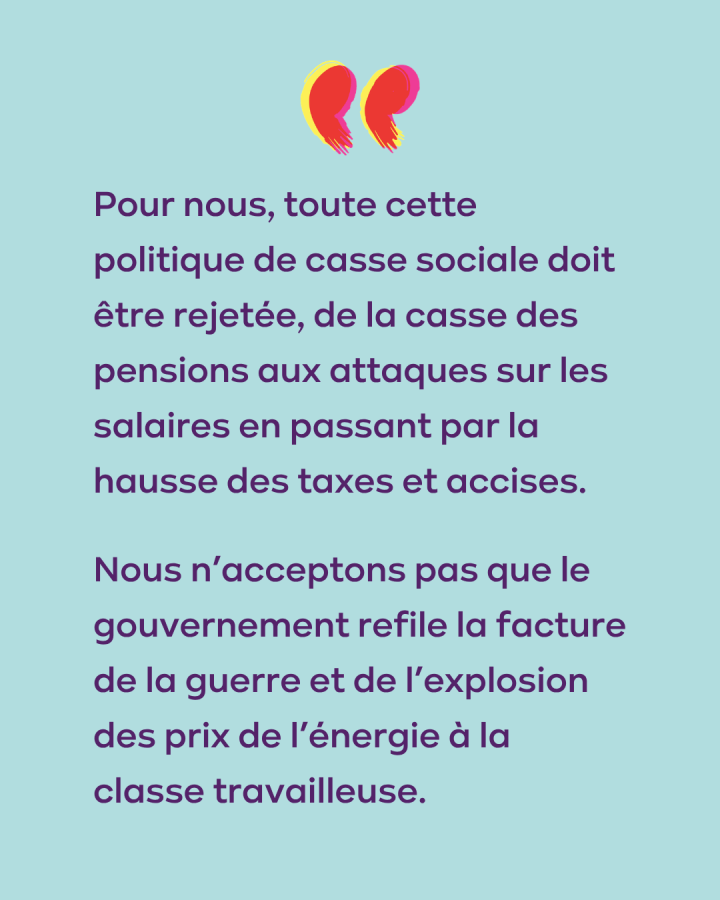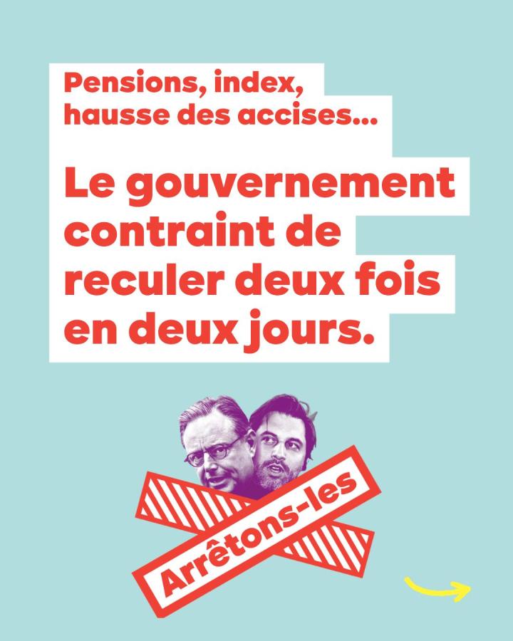 Raoul Hedebouw conclut : « Le gouvernement est beaucoup moins fort qu'il n'essaie de le faire croire. Il ressent la pression des syndicats, du vaste mouvement social et du mécontentement général de la population. Ce report est un premier pas. Pour nous, toute cette politique de casse sociale qui consiste à réduire les pensions et les salaires tout en augmentant les accises doit être abandonnée. Nous ne supportons pas que ce gouvernement veuille à tout prix faire payer aux travailleurs la facture de la guerre et de la hausse des prix de l'énergie. Nous maintiendrons la pression jusqu'à ce que ces projets soient complètement abandonnés ».