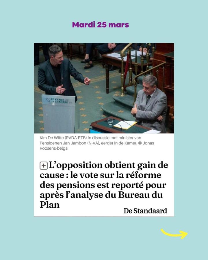 Sous la pression du mouvement social, de l'opinion publique, du PTB et des autres partis d'opposition, le vote sur la réforme des pensions du gouvernement a été reporté. Après avoir tenté de faire passer la réforme des pensions à toute vitesse au Parlement, le gouvernement a été contraint de lever le pied. Mardi 24 mars, le ministre Jambon et les partis de la majorité se sont engagés en commission des Affaires sociales à attendre d’abord l’étude d’impact du Bureau fédéral du Plan. Concrètement, cela signifie un premier report d’au moins deux semaines.