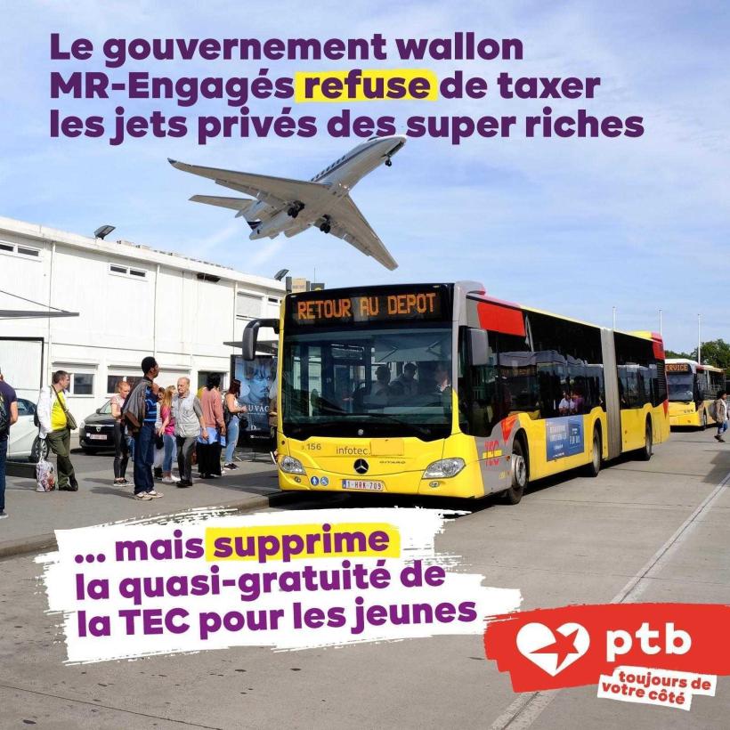 « C'est pourtant bien ça qu’il faut faire, affirme notre député. Puisque le ministre Desquesnes cherche de l’argent, nous avons une proposition concrète à lui faire pour aller chercher l’argent là où il est : une taxe de 2000 euros pour chaque décollage ou atterrissage de jets privés dans les aéroports wallons. Cela rapporterait 14 millions d’euros et cela pourrait financer une grande partie des abonnements des jeunes. Surtout qu’il faut savoir qu’à l’aéroport de Zaventem, depuis avril 2023, les jets privés sont soumis à une taxe. Alors pourquoi ce qui se fait là-bas ne pourrait-il pas être mis en place en Wallonie ? »
