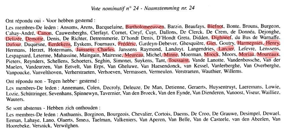 Une nouvelle fois, c’est l’unanimité parmi les députés socialistes pour voter ce projet de loi « portant modification de la loi du 29 avril 1999 relative à l’organisation du marché de l’électricité ». Parmi les députés de l’époque, on retrouve une certaine Karine Lalieux… aujourd’hui ministre des Pensions et de l’intégration sociale mais aussi Alain Mathot ou Yvan Mayeur, respectivement futurs bourgmestres de Seraing et de Bruxelles et qui furent exclus du Parti socialiste pour des affaires de corruption.