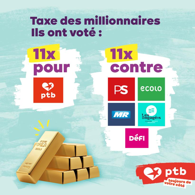 PS et Ecolo disent vouloir taxer les grosses fortunes. Ils ont pourtant voté avec les partis de droite 11 fois (!) contre notre Taxe des millionnaires entre décembre 2020 et décembre 2023 au Parlement.