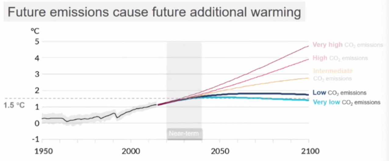 Dans le nouveau rapport, la hausse de la température et ses conséquences sont déterminées pour cinq scénarios climatiques, en fonction de l'évolution des émissions mondiales : émissions très faibles, faibles, moyennes, élevées, très élevées. Il en résulte que nous franchirons la barre d’1,5 degré (au moins temporairement) d'ici le milieu du siècle. Ce n'est que dans le scénario d’émissions « très faibles » que la température augmentera d'un peu plus d’1,5 degré, pour se stabiliser ensuite juste en dessous d’1,5 degré à la fin du siècle.