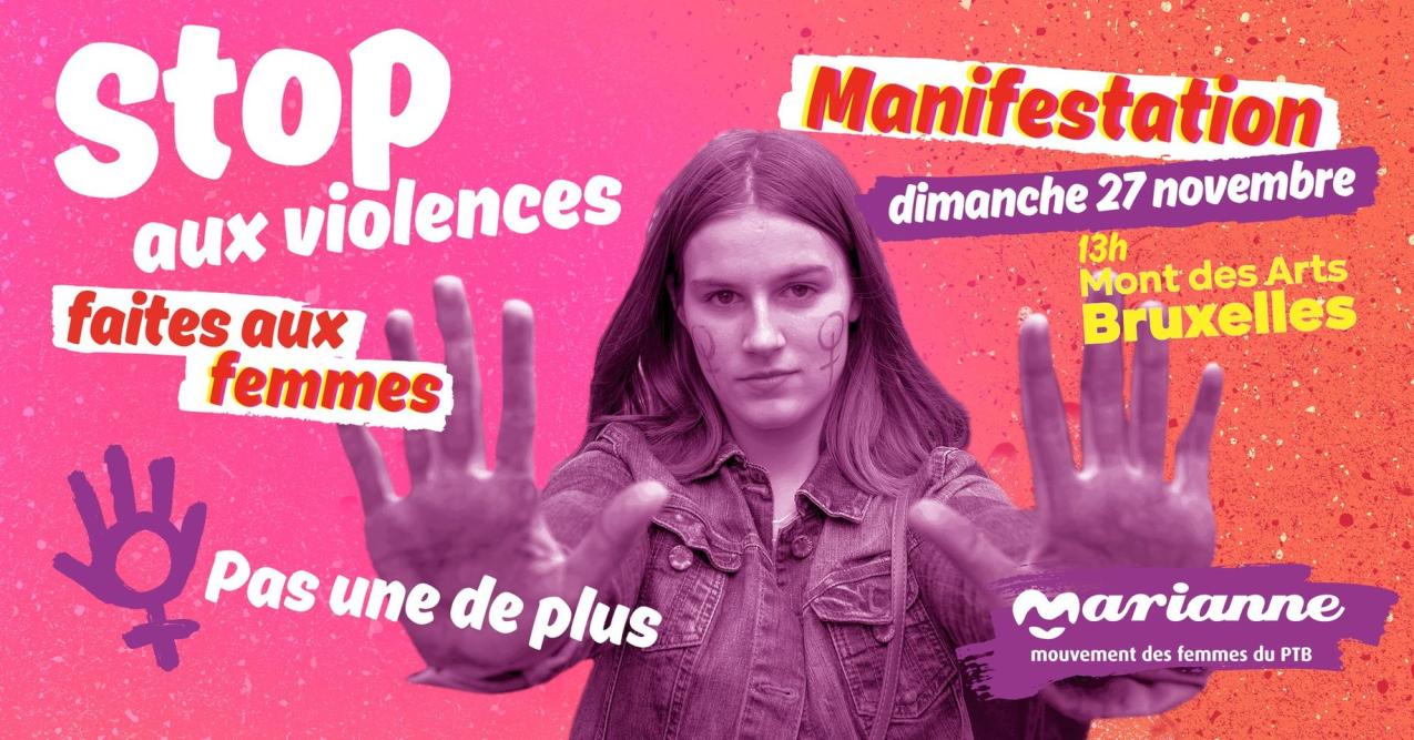 Marianne, le mouvement de femmes du PTB, appelle à marcher avec elles ce dimanche 27 novembre lors de la manifestation nationale contre la violence envers les femmes organisée par la plateforme Mirabal. Nous serons là pour exiger une approche réellement ambitieuse de la part du gouvernement. Et vous, vous venez ? Toutes les infos ici.