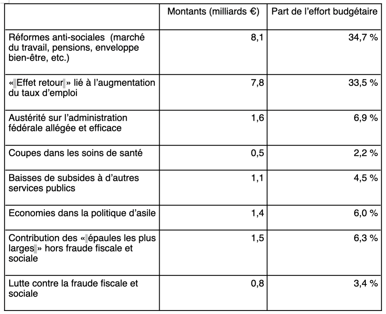 - 7,88 milliards proviennent de l'effet retour de l’augmentation attendue du taux d’emploi jusqu’à 80 % de la population active. Un objectif peu crédible et que le gouvernement entend atteindre en mettant la pression sur les travailleurs malades, en facilitant le recours à des emplois flexibles, au travail étudiant, au travail de nuit ou de week-end et en réduisant les allocations sociales ou le droit à une prépension. Donc un « effet retour » qui sera payé par la classe travailleuse.