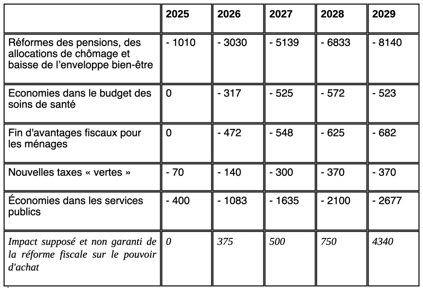 Il y a ensuite les économies sur les pensions, sur les soins de santé, sur le chômage ou les allocations sociales, qui vont impacter le pouvoir d’achat des travailleurs et de leurs proches. Ce sont toutes des mesures que le gouvernement Arizona entend mettre en œuvre immédiatement, dès 2025 ou 2026.