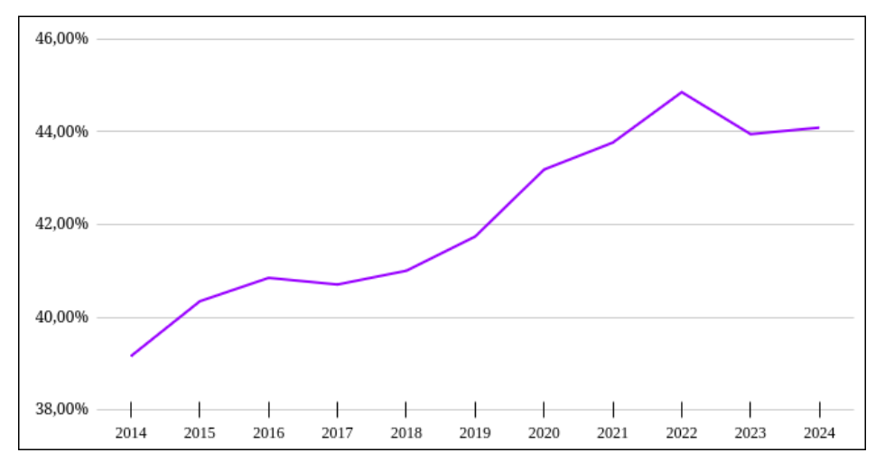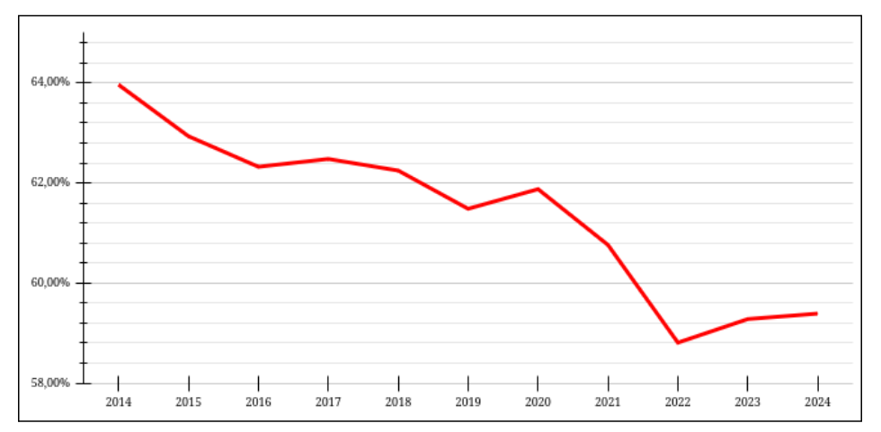 Entre 2014 et 2024, la part des salaires dans la valeur ajoutée des sociétés non financières est passée de 63,96 % à 59,39 %, soit une diminution de 4,57 points de pourcentage. Sur la même période, la part des profits a augmenté dans la même proportion. Cette évolution traduit un déplacement net du partage de la valeur ajoutée au détriment des rémunérations du travail et à l’avantage du capital.