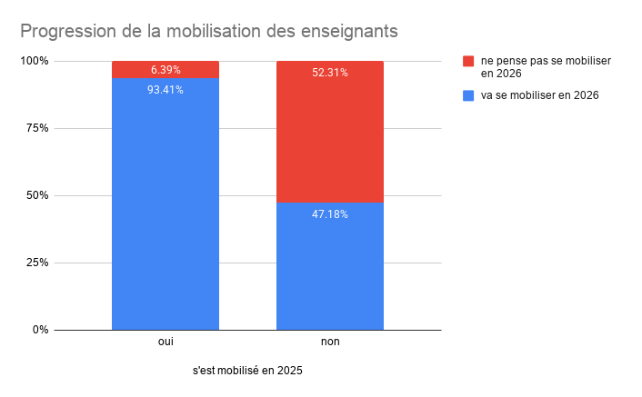 Au-delà du constat alarmant de l’état du secteur : les enseignants sont de plus en plus déterminés. Déjà nombreux en 2025 à s’être mobilisés pour leur pensions et pour l’avenir des écoles et des jeunes, d’autres vont les rejoindre. En effet, près de la moitié (47,2 %) de celles et ceux qui n’avaient pas participé à des actions déclarent vouloir débrayer en 2026. La très grande majorité de celles et ceux qui s’étaient déjà mobilisés comptent poursuivre les actions (93,4 %). Cette écrasante majorité envoie un message politique clair. Elle démontre que la mesure des « 10 % de travail supplémentaire » et les autres attaques n’ont pas brisé la profession, mais ont au contraire cristallisé une colère et une volonté de lutte d’une ampleur inédite.