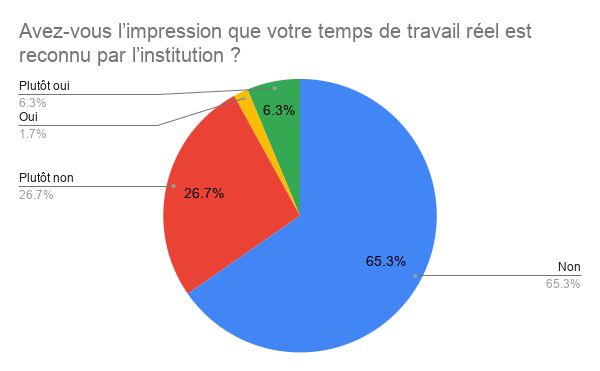 Les chiffres parlent d’eux-mêmes : 92 % des répondants estiment que leur temps de travail réel n’est pas reconnu par leur institution (Annexe 3). Cette absence de reconnaissance officielle est vécue comme un déni de leur engagement.