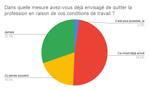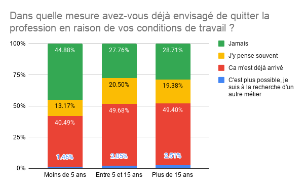 Une large majorité de 69,7 % des répondants ont déjà envisagé de quitter la profession en raison de leurs conditions de travail. Cette proportion alarmante montre que le problème ne concerne pas une minorité, mais bien le cœur du corps enseignant.