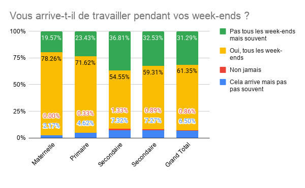 Le chiffre est accablant : 92,8 % des répondants travaillent régulièrement ou systématiquement le week-end. Seule une infime minorité (0,86%) déclare ne jamais travailler pendant ces jours de repos. Pour beaucoup, le week-end est le seul moment pour « rattraper » les préparations et les corrections impossibles à terminer en semaine.