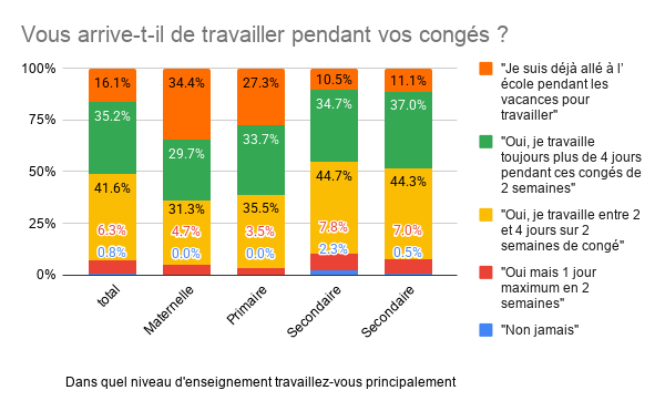 99,2 % des enseignants travaillent pendant les congés scolaires. Ces périodes sont utilisées pour corriger, restructurer ses cours, préparer la rentrée ou accomplir des tâches administratives reportées.