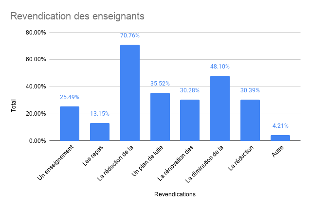 n = 1 734. Revendications : Un enseignement réellement gratuit (matériel, activités, garderies); Les repas scolaires gratuits; La réduction de la taille des classes; Un plan de lutte contre la pénurie d'enseignants; La rénovation des bâtiments scolaires; La diminution de la charge administrative; La réduction collective du temps de travail avec maintien de salaire.