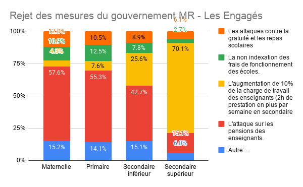 Dans les autres niveaux (maternel, primaire, secondaire inférieur), c'est l'attaque sur les pensions qui arrive en tête des préoccupations (48,8 % en moyenne hors secondaire supérieur). Vient ensuite la dénonciation du travail gratuit supplémentaire. Ce double sentiment – être pressurisé aujourd'hui et appauvri demain – résume le profond sentiment d'injustice.