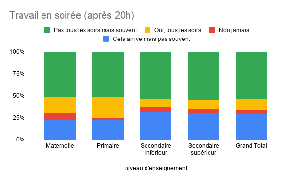66,7 % des enseignants déclarent travailler régulièrement après 20 heures (Annexe 2). Ce phénomène est particulièrement marqué dans le fondamental, où près d’un enseignant sur cinq en maternelle et primaire (environ 20 %) travaille tous les soirs.