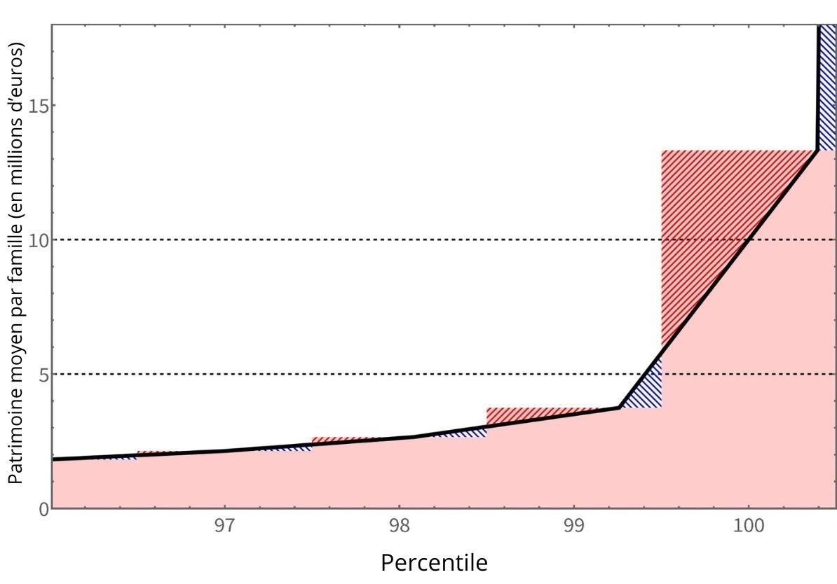Sur le graphique ci-dessus, la partie en rouge pour les quatre percentiles les plus élevés montre la répartition de la richesse par ménage. Les lignes horizontales en pointillés noirs indiquent les limites de 5 et 10 millions d'euros. La courbe linéaire noire indique la distribution de richesse utilisée. Les triangles hachurés rouges et bleus indiquent les parties de la distribution originale qui sont réestimées par l'approximation linéaire. Dans chaque percentile, les deux triangles se compensent l'un l'autre, de sorte que la richesse totale du percentile n'est pas ajustée.