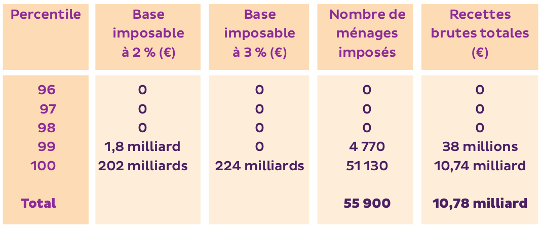 Sur la base de la distribution linéaire de la richesse, nous obtenons la base imposable par percentile suivante :