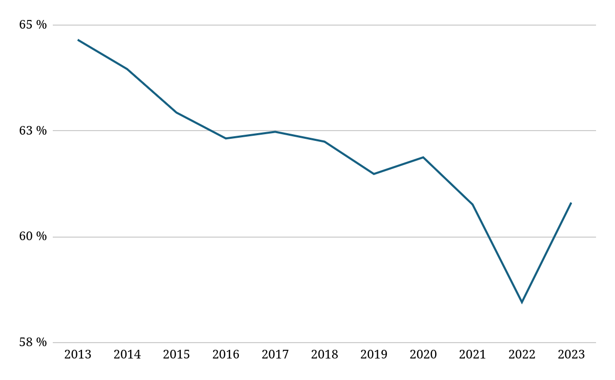 Graphique 1 : Part des rémunérations (salaires + cotisations patronales) dans la valeur ajoutée, 2013-2023