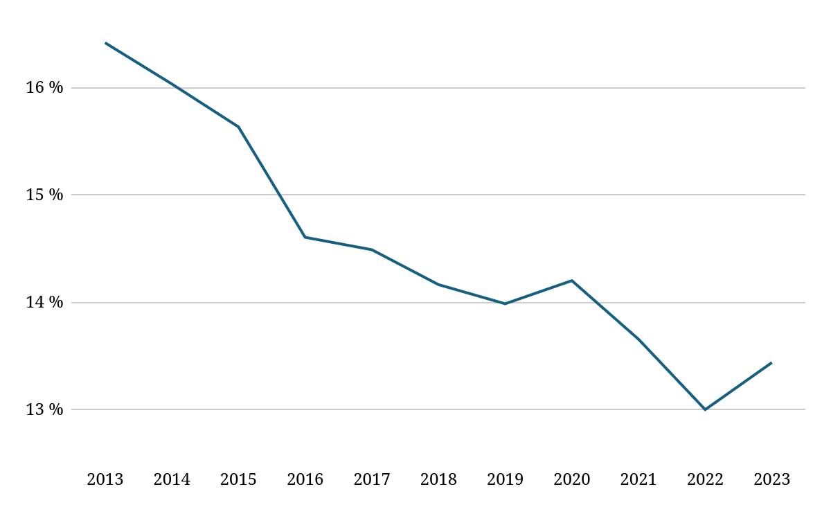 La part des salaires dans la valeur ajoutée des sociétés non financières est passée de 64,7 % en 2013 à 60,8 % en 2023, soit une diminution de 3,9 points de pourcentage. Sur la même période, la part des profits de ces entreprises a augmenté exactement du même montant, soit de 3,9 points de pourcentage.