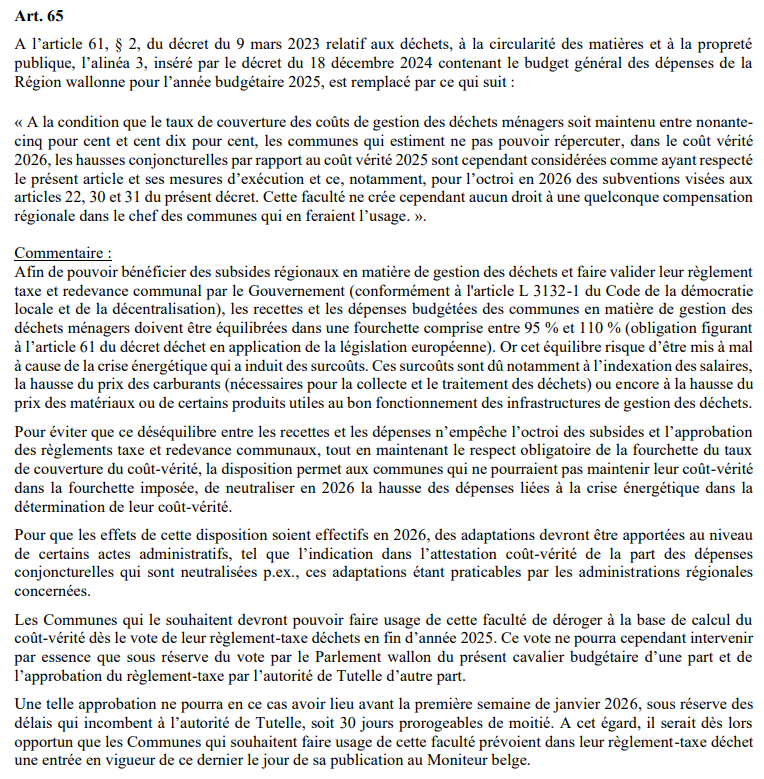 « Il serait dès lors opportun que les Communes qui souhaitent faire usage de cette faculté prévoient dans leur règlement-taxe déchets une entrée en vigueur de ce dernier le jour de sa publication au Moniteur belge. »